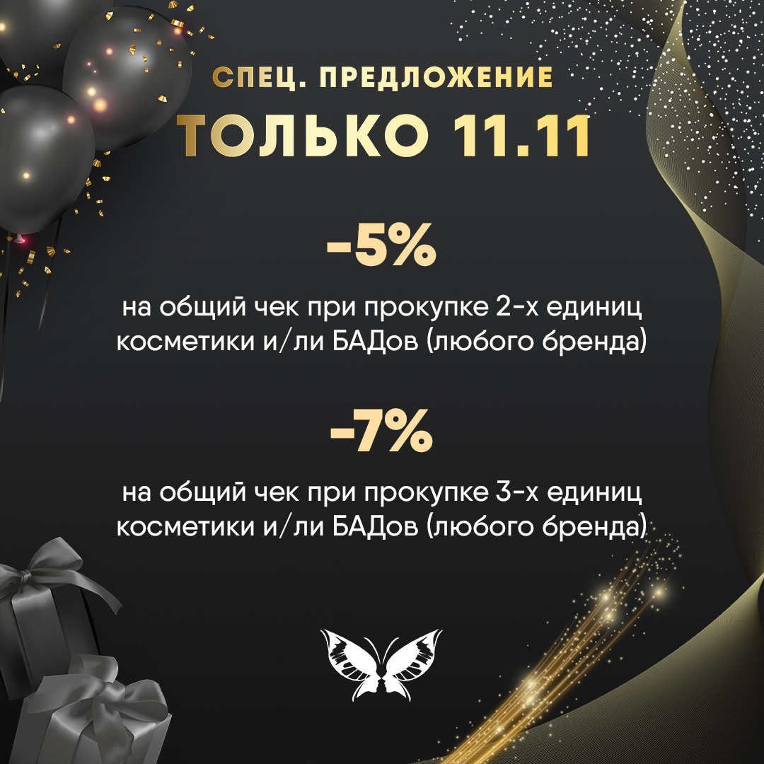 При покупке от 2-х единиц косметики и/или БАДы (любого бренда) -5% скидки на общий чек;